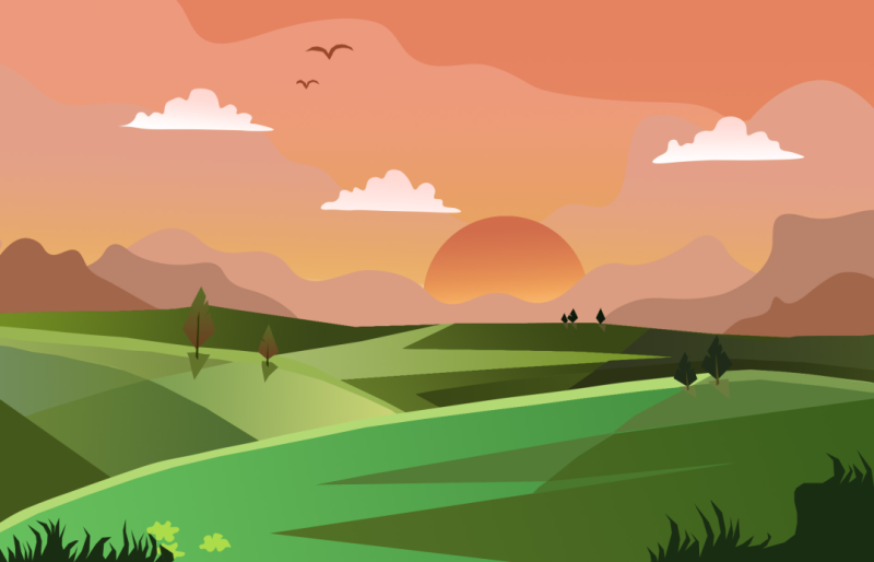 《暖野向晚——扁平化山野日落插画》