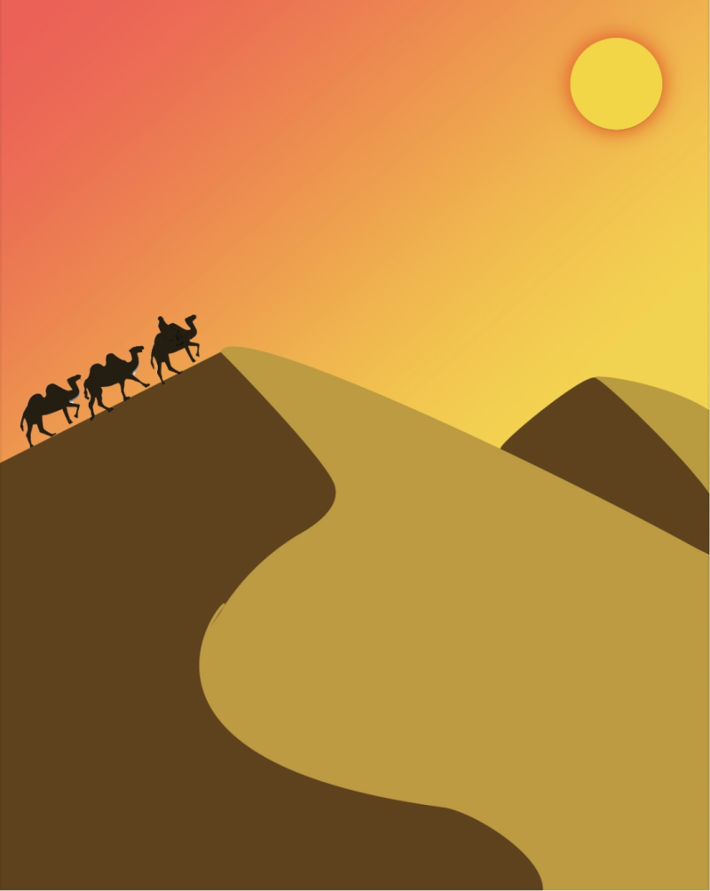 作品简介:临摹加二次创作的方式以扁平化视觉语言重构“沙漠驼队”这一经典丝路意象,核心是“用简约传递悠远”:剥离自然场景的冗余细节,聚焦色彩、轮廓的氛围表达,既契合现代数字装饰、文创产品的审美调性,也让丝路旅途的经典场景跳出厚重的历史符号,以轻盈简约的形式,更易唤起观者对“悠远旅途”的共鸣。