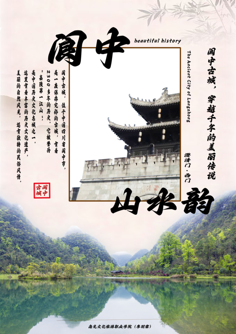 作品简介:本次阆中主题海报设计,选取古城澄清门、嘉陵山水为核心视觉元素,以抠图突出建筑主体,高斯模糊背景营造朦胧的水墨意境;文字选用书法体搭配规整宋体,斜体增添动感,竖排排版契合中式美学;色彩以米白为底,搭配水墨灰与朱红印章,冷暖平衡,既凸显阆中千年古城的古韵,又让视觉层次更清晰。